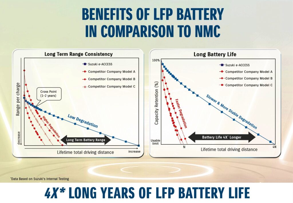 २. अनेक वर्षे टिकणारी बॅटरी : सुझुकी ई ॲक्सेस मध्ये लिथियम आयर्न फॉस्फेट (एलएफपी) बॅटरीचा वापर करण्यात आल्याने ही निकेल मँगनीज कोबाल्ट (एनएमसी) बॅटरीजच्या तुलनेत चार पट* अधिक बॅटरीचे लाईफ देते.